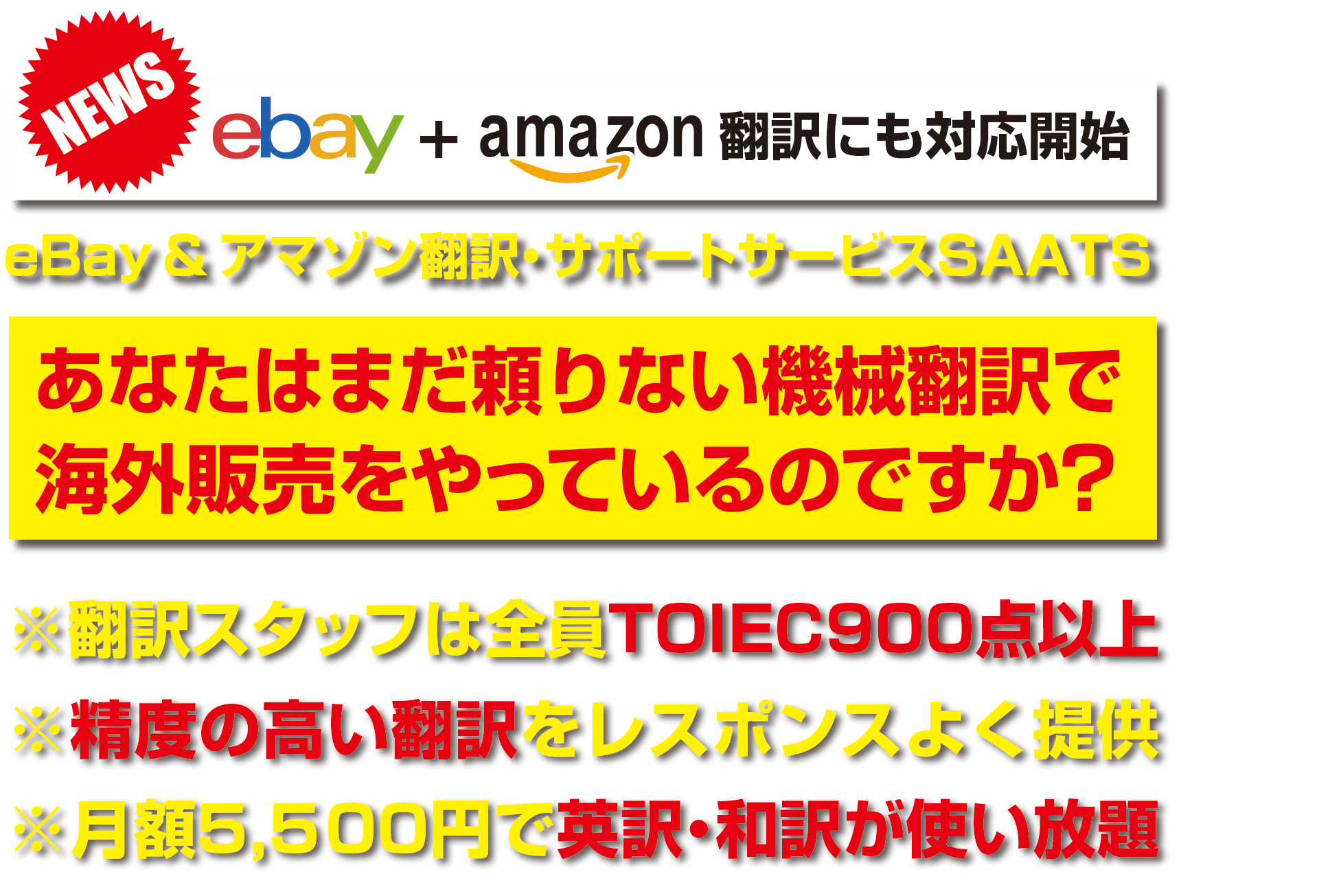 SAATS eBayサポートのメインのサービスとして多くの会員様からご好評いただいているのが、無制限でご利用可能な「英訳・和訳サービス」です。翻訳サービスに携わるスタッフ全員がTOIEC900点以上を取得、質の高い英訳・和訳サポートを定額制で使用量を気にせずにご利用いただけます。