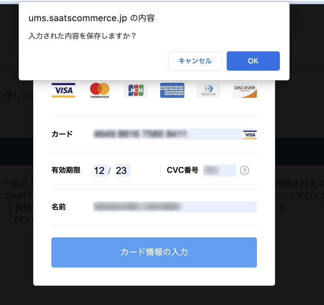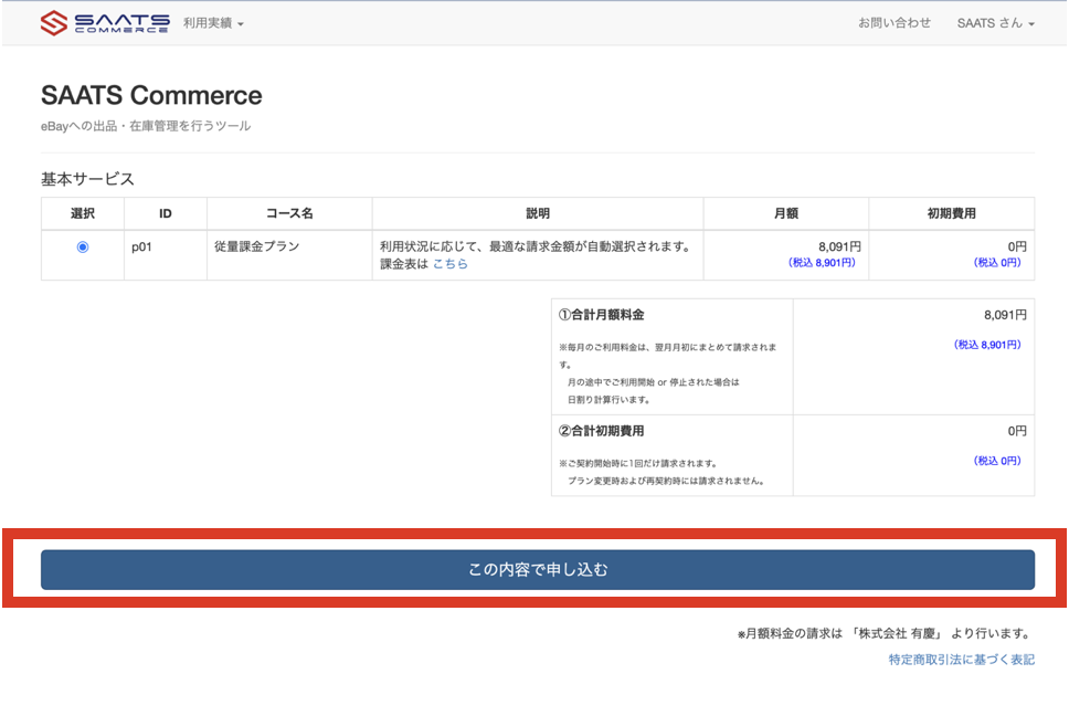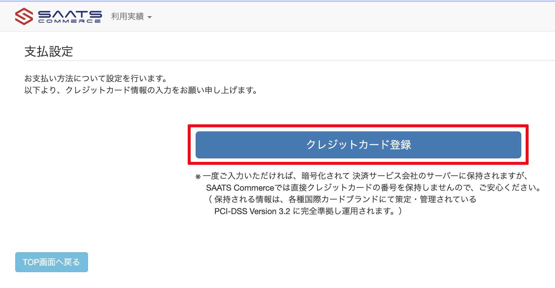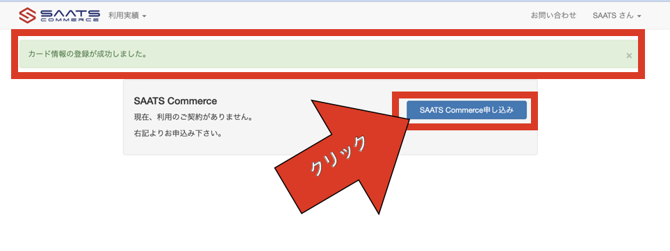 4)画面上部に「カード情報登録が成功しました」とのメッセージが出たのを確認して再度「SAATS Commerceお申し込み」ボタンをクリックします