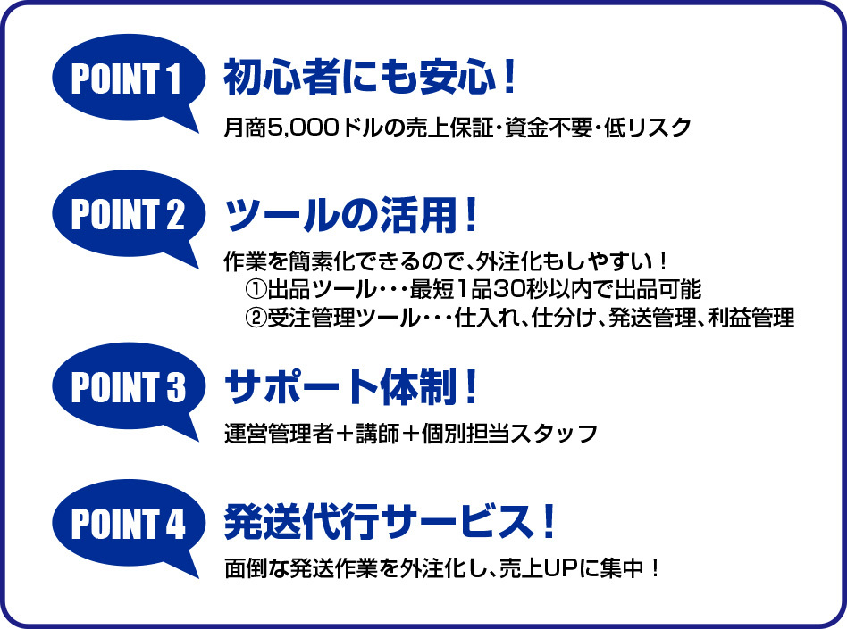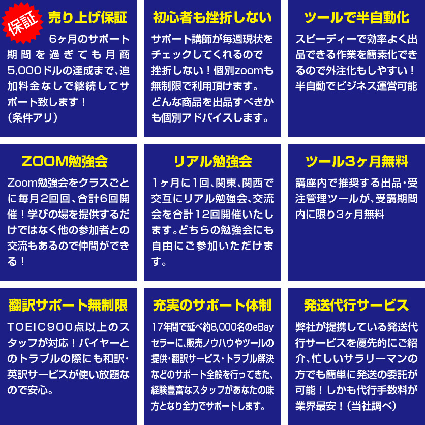 個別サポートにより、お一人お一人に合わせたフォローをさせていただき、月商5000ドルを達成されるまでは、追加料金なしでサポートをさせていただきます。